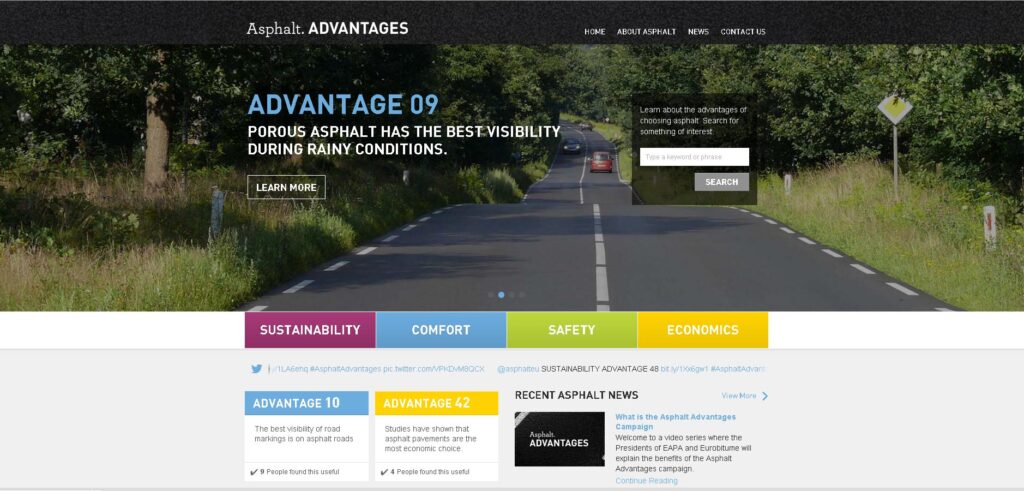 La campagne en ligne « Asphalt. ADVANTAGES » (Les avantages des enrobés) a été lancée conjointement par European Asphalt Pavement Association (EAPA) et Eurobitume pour diffuser des informations utiles et documentées sur les atouts des enrobés bitumineux dans la construction et l’entretien des routes.